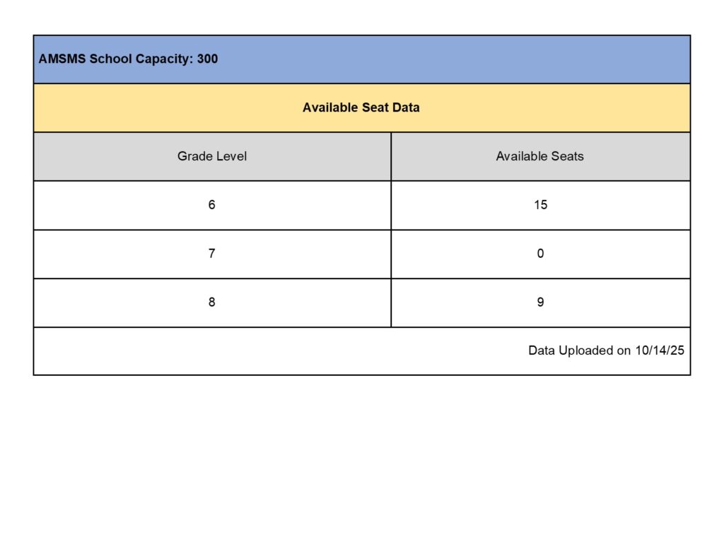 Below is our student capacity/seat availability, by grade level. We are required to update this information every 12 weeks, please note that the capacity number may change during the 12-week period as family members may withdraw or new families apply.
